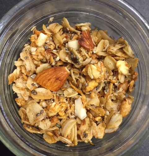 Directions: preheat oven to 250. Mix oats, chia seeds, salt, puffs and half the coconut oil, spread out on a large baking sheet. Cook for about 25 min. Take out, stir, add in nuts, extracts, honey and cinnamon (nuts burn easily). Cook for an addition 15 min. Take out, stir, add honey, the rest of the coconut oil, and dried fruit . Cook for an additional 15 min. At about an hour total, it should come out warm and delicious. Add more honey to make it clumpier. Enjoy!